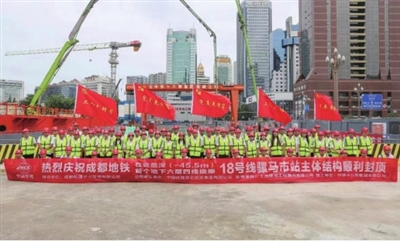 7月15日,由中铁十八局施工的我国西南地区首座超大深度四线换乘地铁车站──成都轨道交通18号线三期骡马市站主体结构全面封顶,项目迎来重要节点。 (文图/井高辉)