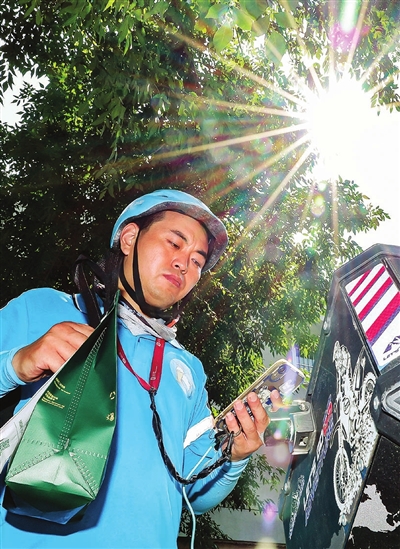 7月18日中午12点,气温35℃。从业三年多的外卖小哥张海军正在送餐。今年夏天,由于高温天气偏多,外卖量随之增加,最多时一天要送近120单。