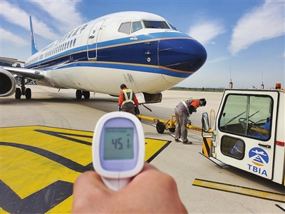 7月17日上午11点30分,天津滨海国际机场机坪温度45℃。机务保障人员与特种车辆驾驶员正在配合完成航班推出保障作业。
