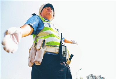7月19日下午4点,气温39℃。市公安西青分局交警支队张家窝大队民警在西青区祥和大道与高泰路交口,为即将开始的晚高峰时段做足准备。