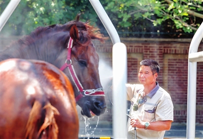 7月1日下午1点,气温38℃。五大道观光马车驿站内,车夫张玉状为马匹冲凉,由于近期超过35℃的高温天气偏多,车夫们为马匹冲凉的次数也随之增加。