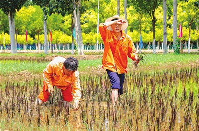 7月6日下午5点,气温38℃。西青区西闫庄村采摘基地四周环绕种植了“七彩水稻”,员工正在进行除草、施肥工作。