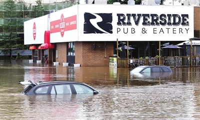 图为7月22日在加拿大新斯科舍省贝德福德拍摄的几乎被洪水淹没的汽车。
