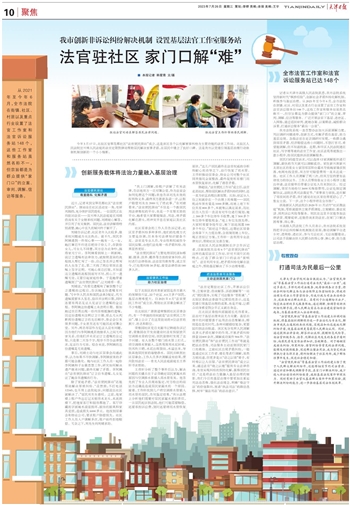 记者从天津市高级人民法院获悉,我市法院系统坚持新时代“枫桥经验”,创新社会矛盾纠纷化解机制,积极参与基层治理。从2021年至今年6月,全市法院在街镇、社区、村居以及重点行业设置了法官工作室和法官诉讼服务站148个,这些工作室和服务站虽然名称不一,但宗旨都是为群众提供“家门口”的立案、审判、调解、信访等服务。广泛开展法官下基层、进社区、入网格,通过巡回审判、就地办案、以案释法,减轻群众诉累,打通诉讼服务“最后一公里”。