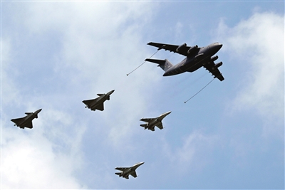 运油-20单机和歼-20双机、歼-16双机加油编队飞行展示。