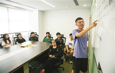 图为企业负责人吴冬给员工分析7月流量数据,确定8月目标。