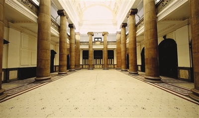 入口内的门厅为井字梁式顶棚,通过大理石台阶后,同样有三座玻璃门与主厅相连。主厅贯通三层,顶部是镶嵌彩色玻璃的半圆形采光屋顶,拱券上有精美雕饰。主厅四周有16根大理石巨柱依次排列支撑,四角柱为方柱,其余为圆柱,柱头由与柱身颜色相近的紫铜板制成。围绕大厅有宽敞回廊,地面由彩色马赛克砖铺装,周围是大理石墙裙。分合式主楼梯在主厅东侧正中,二层楼梯口对应位置的栏板上方安装有一座西洋古典钟表。二层回廊所用栏板为汉白玉米字方格镂空式,地面铺木地板,顶部为拱形。