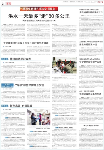 大清河来水方向,根据河北省水文测报,8月2日,大清河上游新盖房枢纽下泄流量达到2500立方米/秒,且仍在继续上涨,河北省境内东淀蓄滞洪区分洪流量加大,洪水预计8月8日前后抵达天津境内,届时我市境内大清河台头镇段及独流减河水位可能上涨。为确保东淀蓄滞洪区我市部分顺利行洪,市水务部门已会同静海区、西青区等组织1450人施工队伍,对东淀蓄滞洪区部分堤埝实施加高加固。目前,市水务部门正加强与水利部海委、河北省水利厅沟通会商,加大独流减河进洪闸、独流减河防潮闸泄洪力度,尽快降低大清河主河槽水位,为东淀蓄滞洪区行洪创造条件。