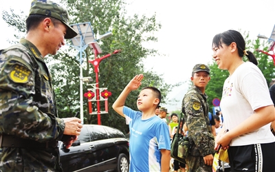 8月2日,在北京市门头沟区妙峰山镇,在乘坐车辆转移前,武天骐(中)向武警北京总队机动三支队的王雷鸣敬礼感谢。来自内蒙古的三年级小学生武天骐跟随家人乘坐K396次列车来北京,受强降雨影响被困。8月2日上午,他跟随家人在武警北京总队机动三支队官兵的护送下,转移至丰台火车站。新华社发