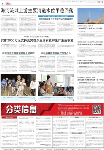 据水文监测统计,当前海河流域子牙河、永定河、大清河、北三河等河系上游主要河道均平稳退水。其中,子牙河系黄壁庄水库7月31日7时入库洪峰流量6253立方米每秒,8月3日12时入库流量203立方米每秒;大清河系张坊7月31日22时洪峰流量6200立方米每秒,8月3日12时流量539立方米每秒;永定河系三家店7月31日13时40分洪峰流量3140立方米每秒,8月3日12时流量175立方米每秒;北运河北关闸8月1日0时洪峰流量1145立方米每秒,3日12时流量140.6立方米每秒。