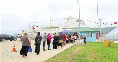 图为“和平方舟”号医院船靠泊汤加期间,当地民众和华人华侨在码头排队就诊。