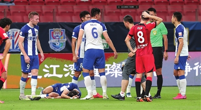 本报讯(记者 顾颖 摄影 刘欣)昨天晚上,在上海浦东体育场,客场作战的天津津门虎队在中超联赛第20轮比赛中,1:2负于上海海港队。观看了这场比赛的球迷相信都会有同感,面对津门虎队的失利,大家内心的感触不是遗憾、失望,而是难过、心疼──整场比赛,海港队大尺度犯规频发,上半场张琳芃对明天的犯规,造成了明天左侧脚踝骨裂,很有可能告别赛季。