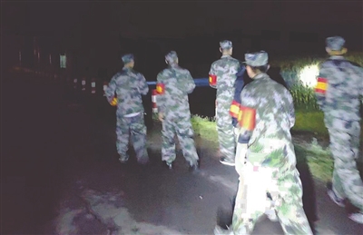 防汛人员夜间沿武清区永定河河堤巡查排险。