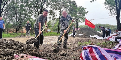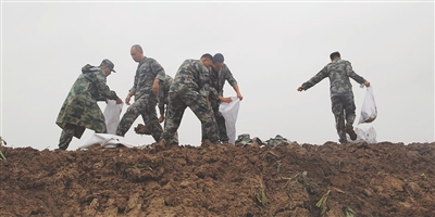 民兵在武清区黄花店镇永定河堤上排险加固。