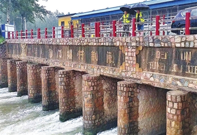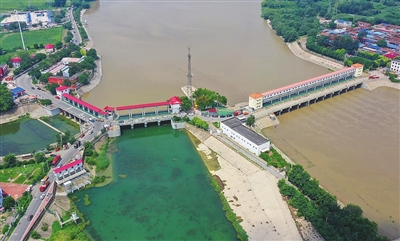 武清区河西务镇工作人员在水闸上查看北运河水情。