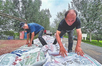 西青区组织人员搬运沙袋加固子牙河河堤。