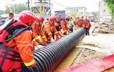 8月6日,在河北省涿州市刁窝镇东张村,唐山消防救援支队队员在进行排涝作业。 新华社发