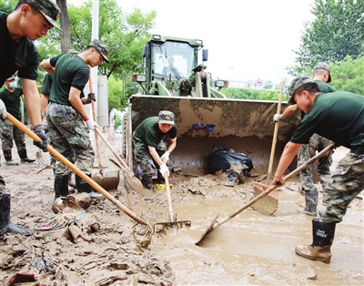8月7日,武警河北总队机动支队官兵在涿州朝阳大街搬运垃圾、清淤清泥、冲洗街道。 新华社发