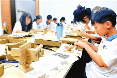 天津蓟州独乐寺是在哪个时代翻修的?榫卯结构是如何连接起来的?观音阁里有哪些故事?老师结合馆内正在展出的“天津数字文博展”,为孩子们讲述独乐寺背后的故事。在“探秘中国古建筑”活动现场,小朋友们在老师的指导下,搭建独乐寺模型,了解中国古建筑的精髓。