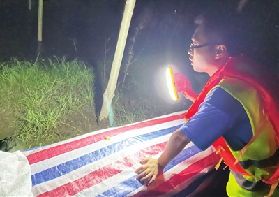 一脚水一脚泥走到管涌的位置,杜国量拨开草丛,放低应急灯仔细查看,按按这儿、戳戳那儿,寻找是不是仍有积水。之后,他又跳上沙袋,从高处巡视整个堤坝内侧。灯光下,一小片积水引起了他的注意,一个纵身跳到泥地上,没承想右脚整个陷进松软的泥里,拽了半天才把鞋子拔出来。