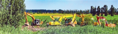 市水利集团组织300人的抢险队,上百台工程机械在静海区茁头排干西堤加固涉险堤坝。