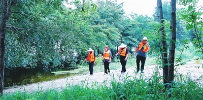 8月4日以来,西青区在子牙河、独流减河大堤上成立66个堤防巡查工作站临时党支部,近千名共产党员24小时轮流上堤,全方位、无死角地巡护。图为日前西青区辛口镇第十五巡堤小组在独流减河堤坝上巡堤。 本报记者 潘立峰 通讯员 袁忠清 摄