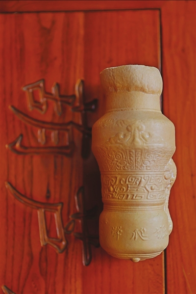 “‘颁瓟斝’范制匏杯的灵感创意来源于《红楼梦》中所记‘妙玉奉茶’桥段。” 赵伟介绍,“此匏杯珍贵之处在于它的工艺复杂,外形图案为饕餮纹,侧面有凸出的兽首,底部为三个立足,这些在范制葫芦工艺中难度大,上品的颁匏斝少之又少,非常难得。”