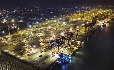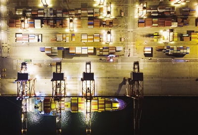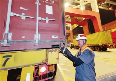 夜晚的天津港联盟国际集装箱码头灯火通明、装运繁忙。岸桥边,港口工人赵建新现场指挥着拖车,并对集装箱扭锁进行拆装。一晚上,他要为300多个集装箱拆装扭锁1000余个。