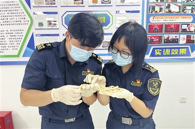 此前,一个申报为“食品”的进境邮件在邮局海关机检查验时,图像显示异常。经人工查验,海关关员发现一串由100枚乳白色圆珠穿成的手串,具有象牙纹路特征。后天津海关动植物与食品检测中心鉴定该物品为象牙制品。