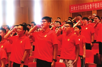 天大162名新生骨干参加“天麟班”培训时宣誓。 通讯员 焦德芳 本报记者 姜宝成 摄
