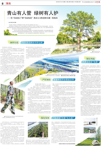 在天津,像贲永明一样的林长还有很多。“天津建立的是四级林长制,从市委书记、市长到区、镇、村的主要负责人,由各级党政主要领导担任林长。目前,全市共有18位市级林长、290多位区级林长、1900多位乡镇级林长、5300多位村级林长。”市规划资源局(市林长办公室)森林野保处副处长教效同说,我市通过市级林长发挥“头雁”作用,各级林长夯实责任,对林业工作提级管理,以“林长制”促“林长治”。