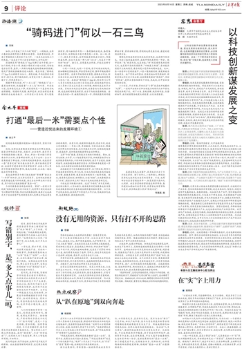 螺蛳壳里做道场讲究的是统筹的观念,也是精巧的功夫。别出心裁的基层创新,是城市有机更新的一部分。城市更新,“更”的是形态,也是功能;“新”的是看得见的空间变化,也是看不见的品质提升。“旧瓶装上新酒”,在功能品质提升上做的增量,要求的是工笔作画的精细态度。比如,在一些老旧小区的改造中,一区一策的微创新、微更新成为改造重点。地下管网如何整治、充电设施如何见缝插针、闲置空间如何变身口袋公园,这些都需要磨好“绣花针”、用好“穿针法”,更加注重在细微处下功夫、见成效,打开宜业宜居的新空间。
