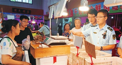 河东区市场监管局开展农贸市场在用计量器具专项监督检查,执法人员重点检查商户是否存在使用不合格电子秤、破坏电子秤准确度、伪造数据等计量违法行为,督促商户依法诚信经营。