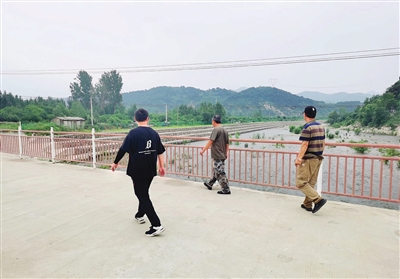 ②杨庄水库管理所工作人员巡查河道。