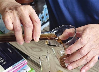 拍摄时余幽芳用饮料作为教具来给“学生”讲解化学知识。