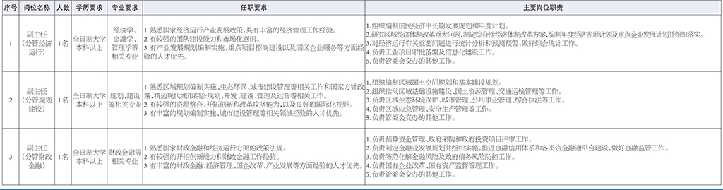 (一)分管经济运行工作的副主任1名。熟悉国家经济运行产业发展政策,具有丰富的经济管理工作经验。有产业发展规划编制实施、重点项目招商建设以及园区企业服务等方面经验的人才优先。