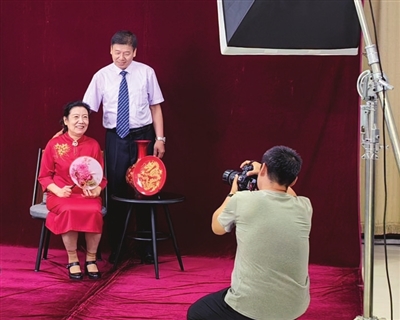 活动现场,社区工作人员为每对夫妻搭配服饰、化妆。老人们从黑发到白发,从平凡到幸福,一次默契对视、一个真心笑容,都诉说着相濡以沫的几十年。和平区“最美家庭”62岁的王春燕阿姨说:“我跟爱人老吴结婚30多年了,那时哪有什么结婚照,只有一张领证的照片,还是黑白的。没想到这次社区给我们准备的节日礼物弥补了遗憾。”
