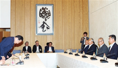 8月21日,在东京首相官邸,日本首相岸田文雄(左一)会见日本全国渔业协会联合会会长坂本雅信(右一)一行。 新华社发