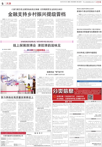 市金融局、市农业农村委、市财政局、人民银行天津市分行、国家金融监督管理总局天津监管局、天津证监局六部门联合发文,聚焦我市农业重点领域,引导规模资金支持我市高标准农田、智慧农业、仓储保鲜冷链物流、农村人居环境整治等乡村振兴重点项目。全面梳理“小站稻、蔬菜、畜牧、水产”4条农业产业链重点企业,形成企业库。组织金融机构围绕4条产业链“链主”企业绘制产业链图谱,开展定制化、全产业链金融服务,指导“农”字头金融机构打造“金融助力农业产业链发展创新基地”。
