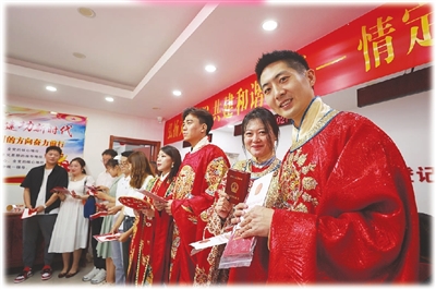 七夕节,红桥区迎来婚姻登记高潮,区民政局为220对新人办理了结婚登记,并举办“弘扬文明婚俗、共建和谐幸福”──情定七夕、爱在红桥结婚登记集体颁证仪式,倡导简约适度的婚俗礼仪,引导新人们树立正确的婚恋观念,更好地传承和弘扬爱情忠贞、家庭和睦等中华优秀传统家风文化,让新人幸福领证。