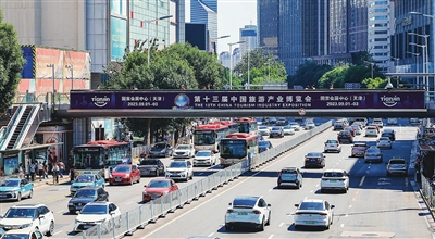 连日来,我市在多条重点道路沿线布置旅博会宣传主题的道旗、灯箱及部分天桥上的视觉内容,为即将召开的旅博会营造浓郁氛围。 本报记者 潘立峰 摄