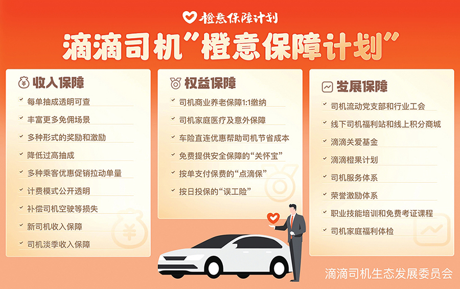 除了切实为司机们送福利、送关怀,滴滴也在多方面持续关注司机的成长与权益保障。在主管部门的指导和帮助下,滴滴升级了“橙意保障计划”,从收入保障、权益保障、发展保障三个层次出发,系统性、常态化落实司机权益保障工作。