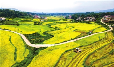 初秋时节,各地农民忙碌在田间地头。8月29日,在湖南省娄底市双峰县井字镇铜梁村,农民驾驶收割机收割中稻(无人机照片)。 新华社发
