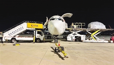 起飞前,航班正在天津滨海机场进行货物装机。 照片由天津货运航空提供