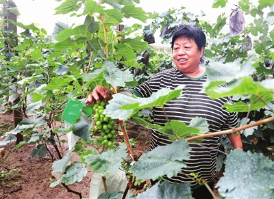 基地东头儿,南贾庄村党支部书记王武生正蹲在葡萄架前察看葡萄生长情况。“这260亩种的是专供王朝酒业的酿酒葡萄,今年是第一年试种,现在长势很好,再过一两周就可以收获。”王武生说,“这些葡萄去年栽种,越冬后今年首次结果,2年之后到达丰产期,预计亩产5000斤左右,届时一年产值可达260万元。”