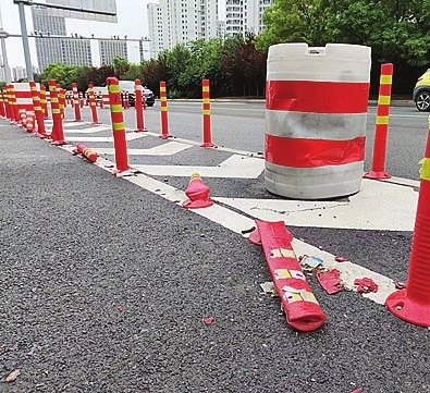 8月24日早上,记者前往现场,发现在位于新阔路与真理道交口的辅路出入口,原本设立了数十根红色的半米左右警示桩,其中的18根已经倾倒和损坏,另有12根警示桩只剩底座和螺丝,散落一地的塑料碎片让现场一片狼藉。附近商家介绍,这个情况已经出现一两个月了,受访市民希望设置单位能够及时对破损警示桩进行修复。