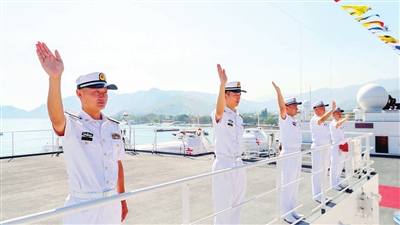图为“和平方舟”号医院船任务官兵向迎接人群挥手致意。新华社发