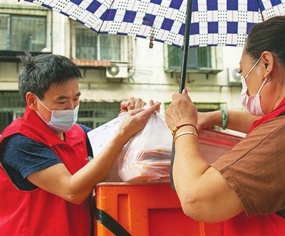 7月31日我市处于强降雨天气,为保障老人用餐,乐聆养老服务中心送餐车辆由平时的33辆,增加至39辆,负责配送的志愿者也增加了一倍。中午11时,家住河东区中山门互助西里,83岁的张重英老人拿到热乎乎的午餐,向送餐志愿者表示感谢。 本报记者 刘欣 摄