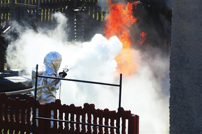 图为9月5日,演习人员在白俄罗斯明斯克州进行消防救援演习。