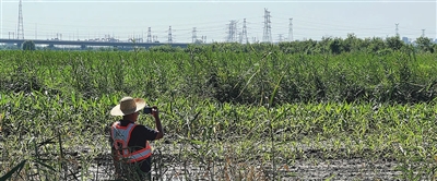 理赔人员在北辰区大张庄镇的受损玉米地进行查勘。